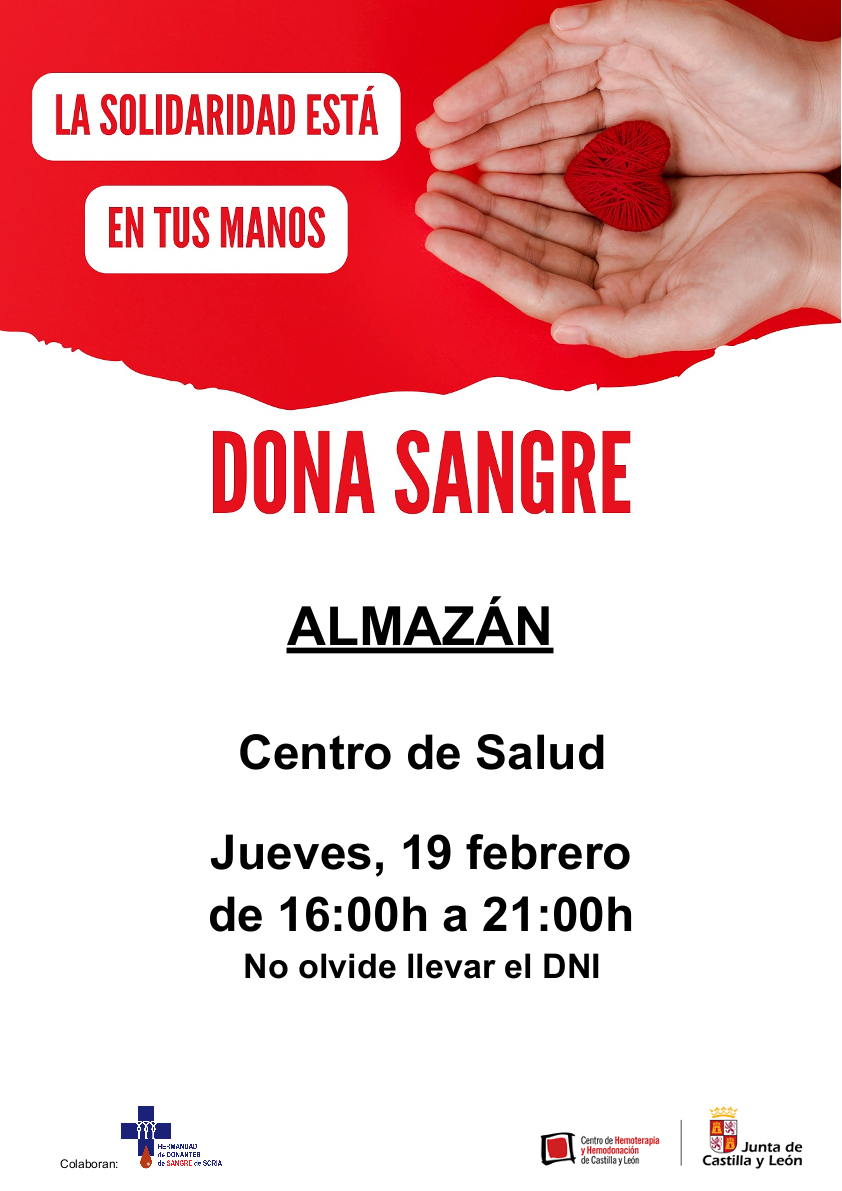 Para colaborar, se puede donar sangre en el centro de salud de Almazán el jueves 19 de febrero, de 16:00 a 21:00h (no olviden su DNI).