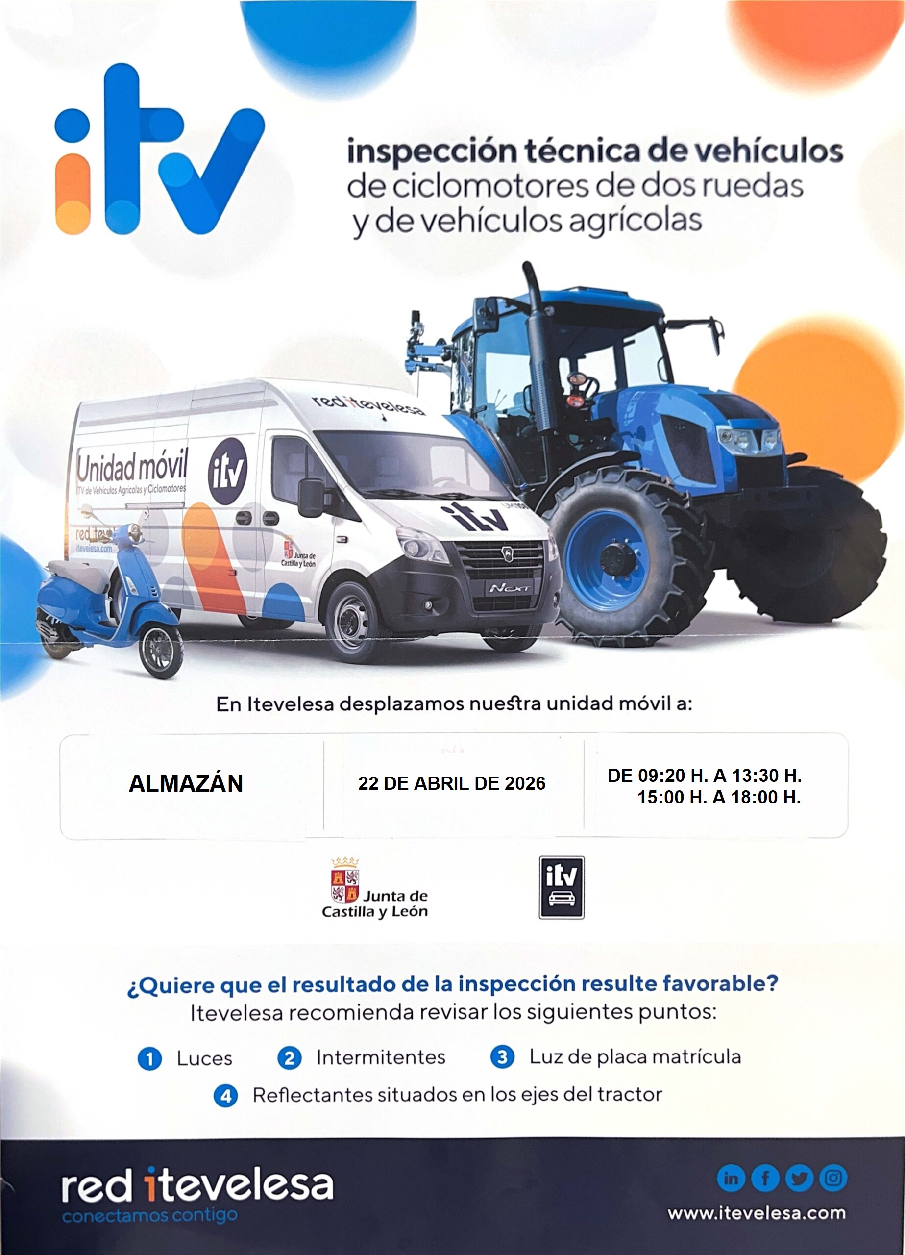 El próximo 22 de abril se desplazará la unidad móvil para realizar la inspección técnica de vehículos de ciclomotores de dos ruedas y de vehículos agrícolas de 9:20 h. a 13:30 h. y de 15:00 h. a 18:00 h.