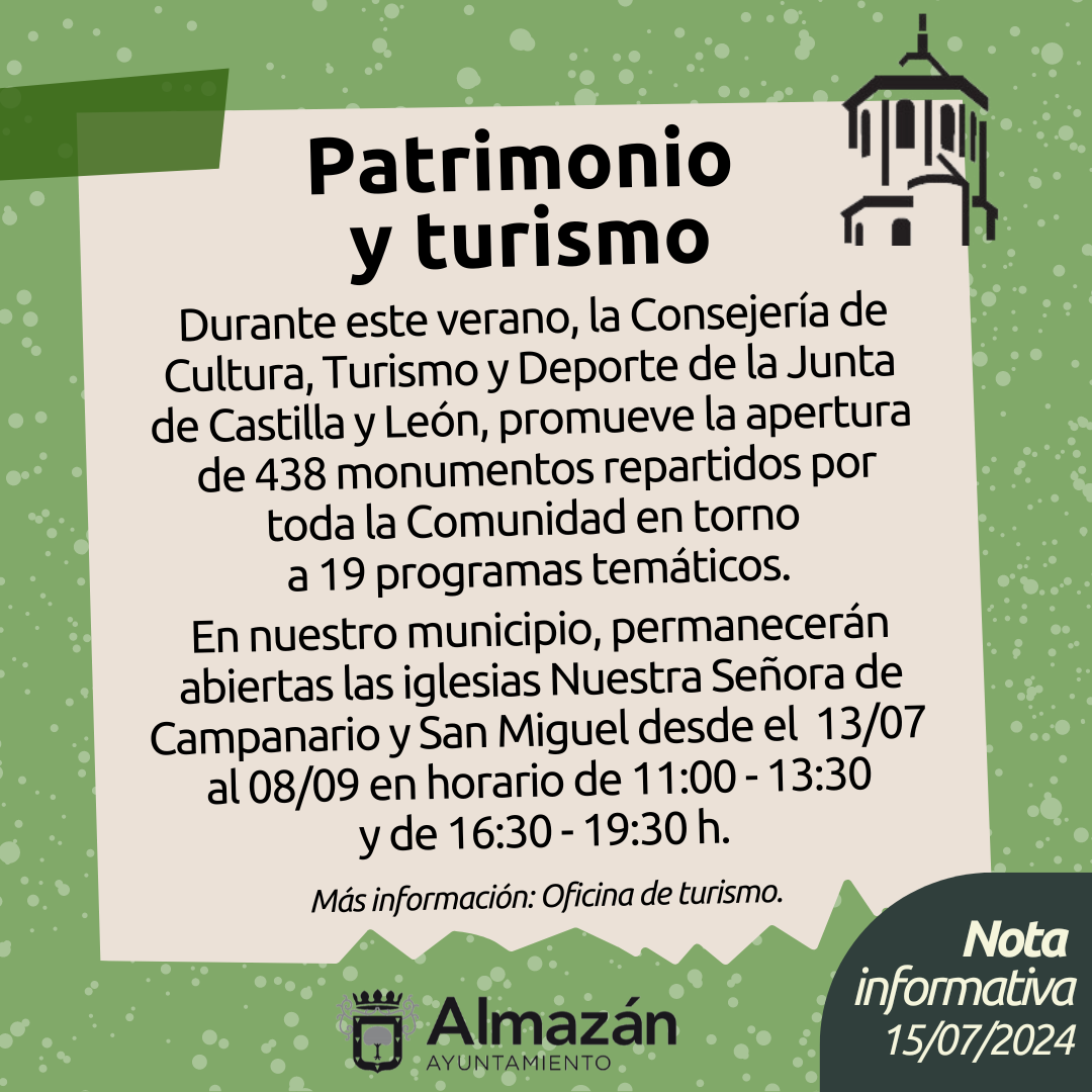 En nuestro municipio, permanecerán abiertas las iglesias Nuestra Señora de Campanario y San Miguel desde el 13/07 al 08/09 en horario de 11:00 – 13:30 y de 16:30 – 19:30 h.