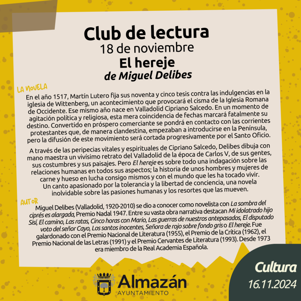 Club de lectura noviembre El Hereje de Miguel Delibes, día 21/11. Club de lectura de Almazán.