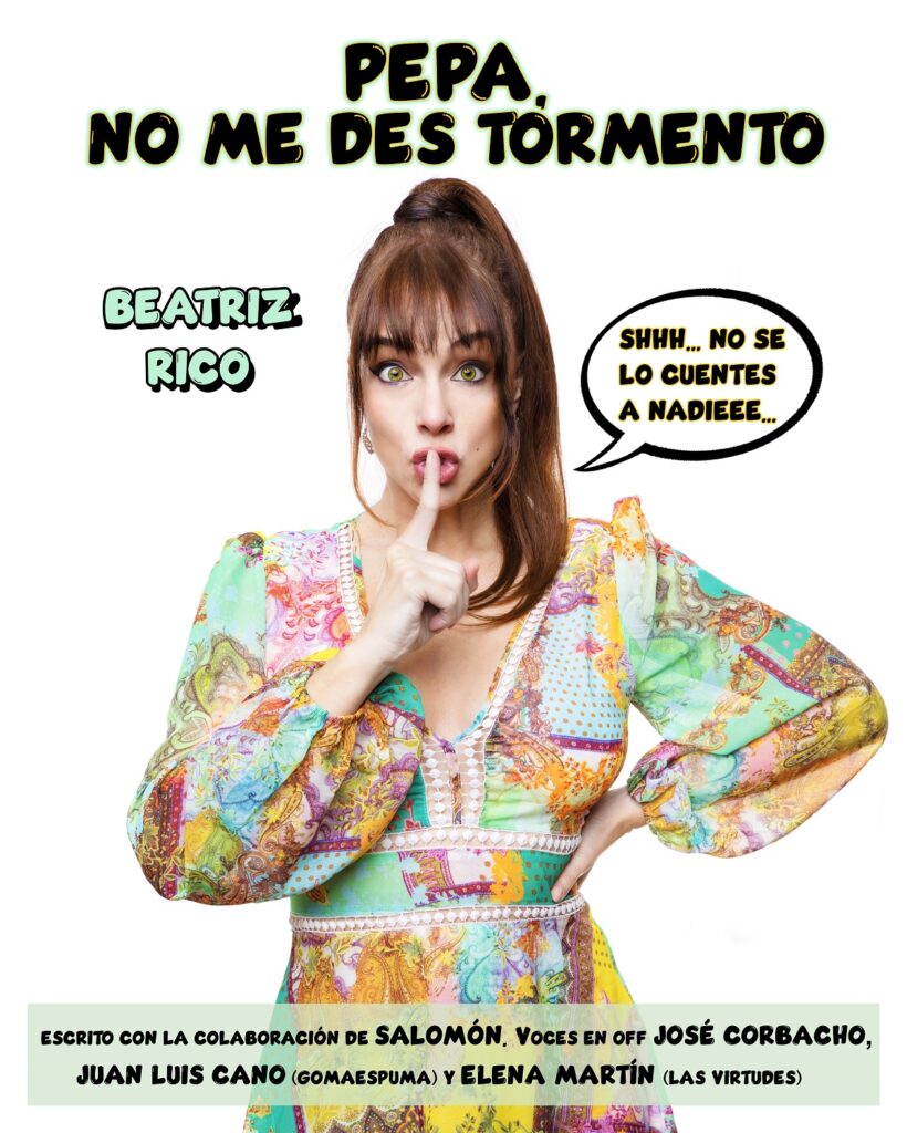 De la mano de Salomón (Paramount Comedy, Corta el Cable Rojo…), también coautor de los anteriores monólogos de Beatriz Rico “Mejor Viuda Que Mal Casada” y “Antes Muerta Que Convicta”, y arropada por las voces en off de maestros del humor como José Corbacho, Juan Luis Cano (Gomaespuma) y Elena Martín (Las Virtudes), se construye un divertidísimo monólogo en el que no faltan los gags a un ritmo trepidante, música, imitaciones, interacción con el público que será cómplice de Pepa, y hasta un momento para la reflexión que nos pondrá un nudo en la garganta